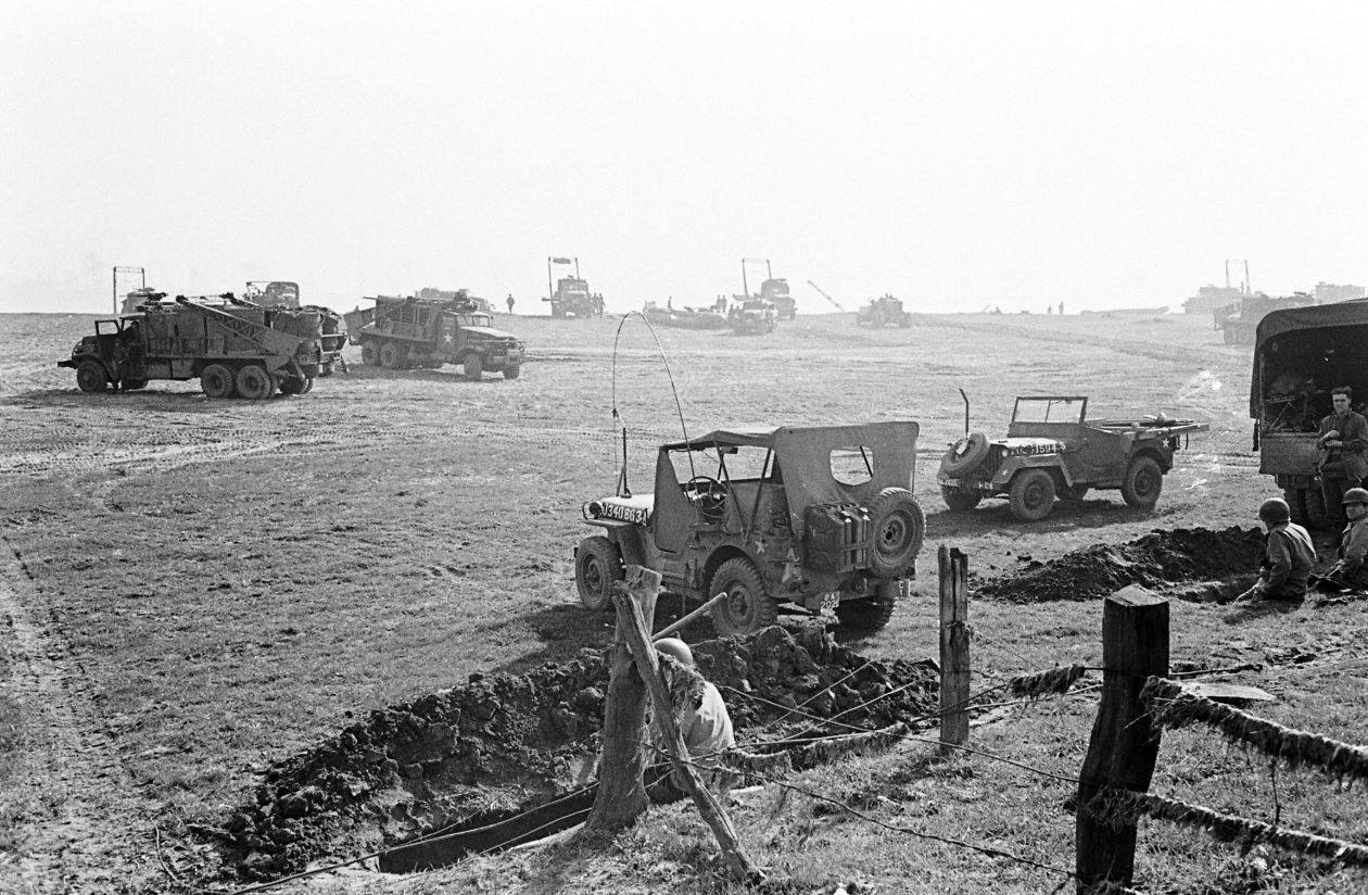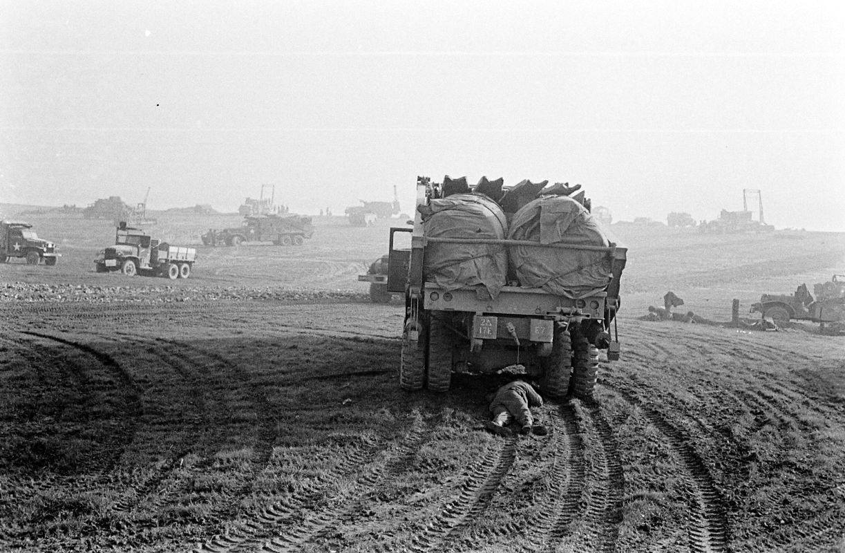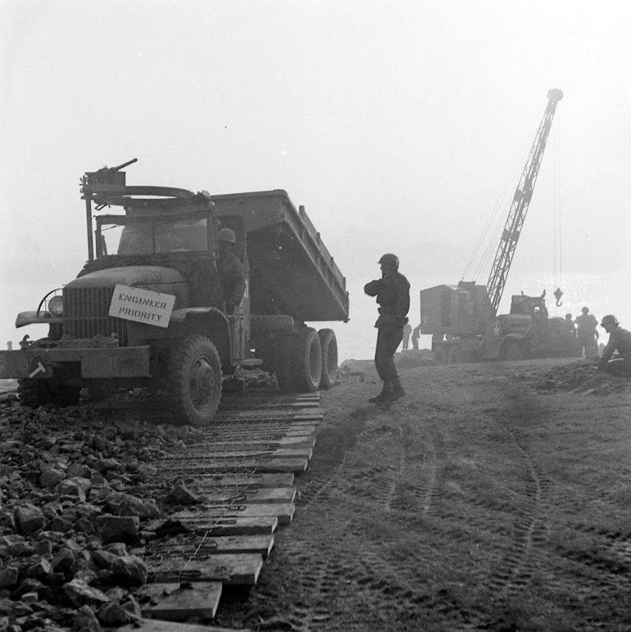 It took twenty-five 2-and-a-half ton GMC CCKW trucks to transport the bridge parts to the construction site, part of the Red Ball Express