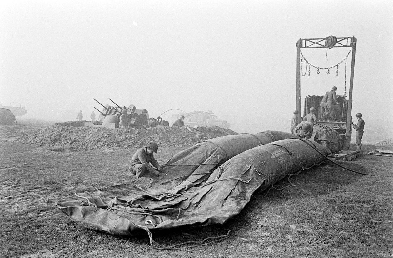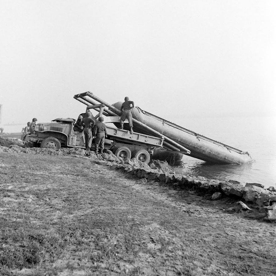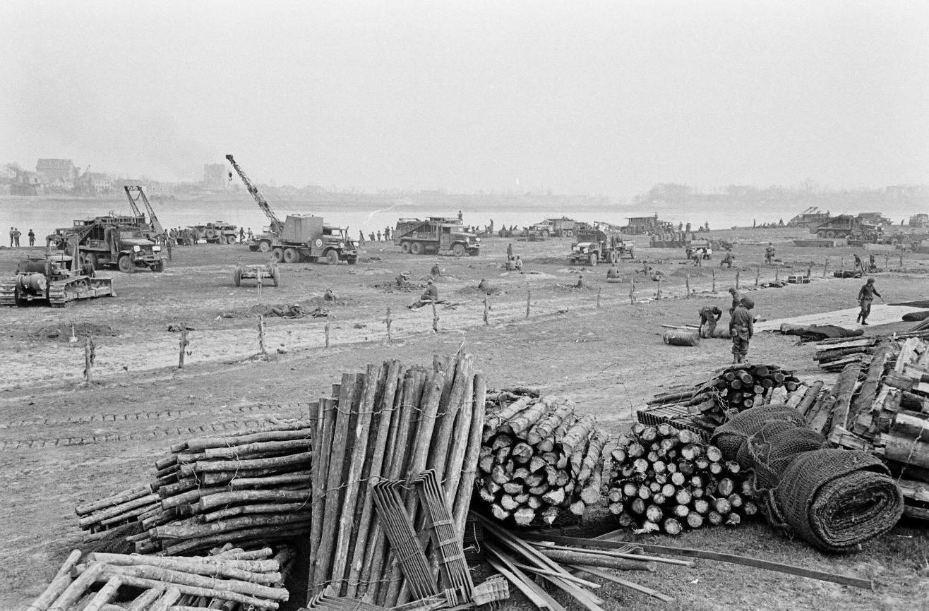 In the night of 23 March, Company E and C of the 17th Armored Engineer Battalion, part of U.S. 2nd Armored Division, constructed treadway rafts to prepare the crossing of the Rhine River about five kilometres south of Wesel.