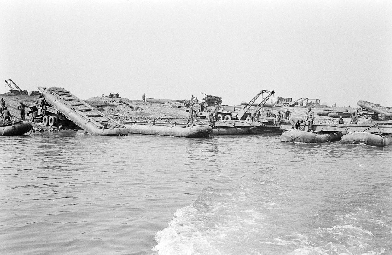 After arrival at the site a change in instructions ordered the building of rafts to ferry vehicles across. This  was done. Enemy small arms fire, which had been fairly strong when the group first arrived at the area, now began to diminish, but incoming artillery was arriving with more frequency. Construction of the bridge, nevertheless, started at 08:35 and work progressed in a very satisfactory manner, the reward of meticulous planning and hard labour. Artillery fire caused 20 casualties before the last float was worked into place 7 hours later. At 1530 the bridge was opened to traffic a 1,112 foot span completed in less time than any ether bridge across the famed barrier.